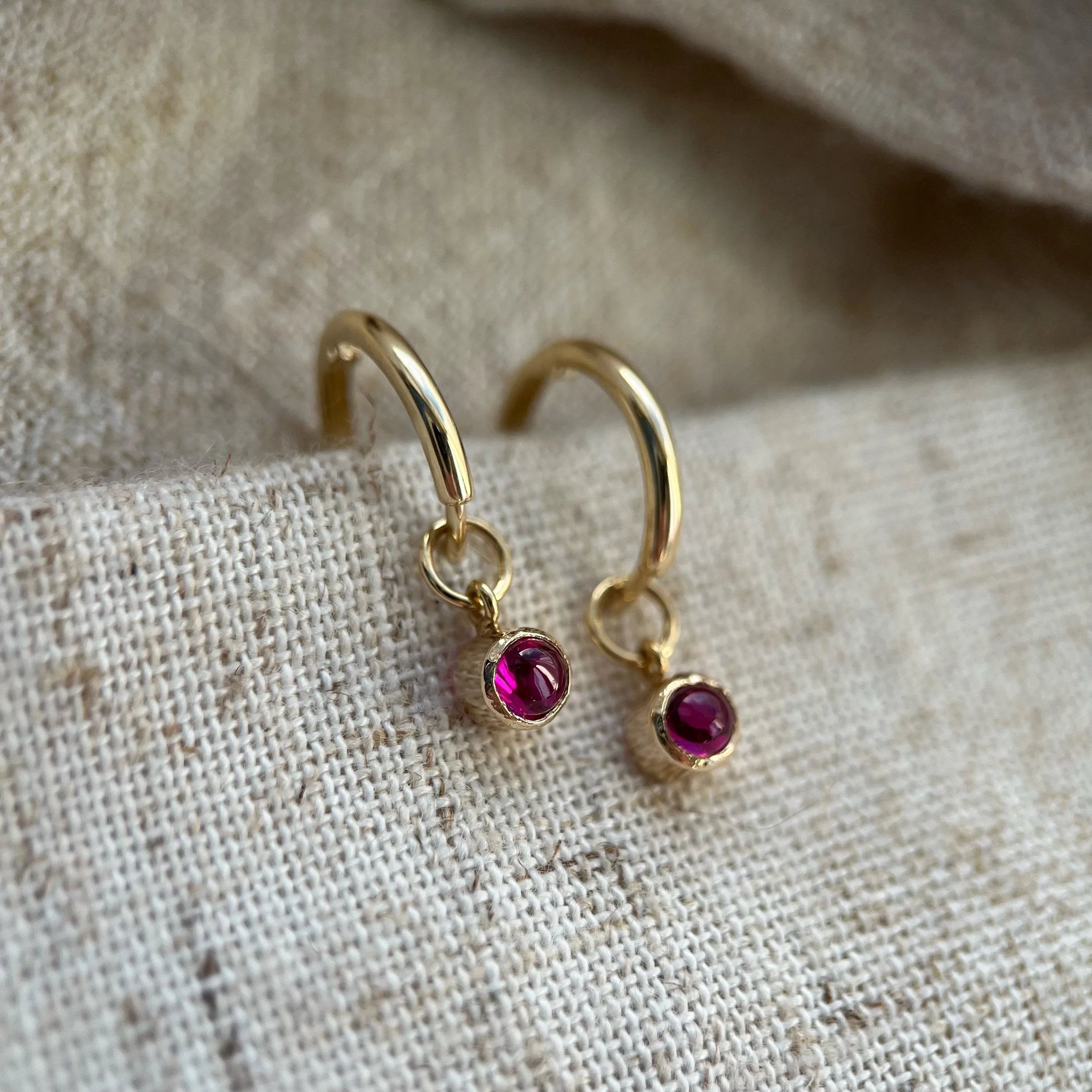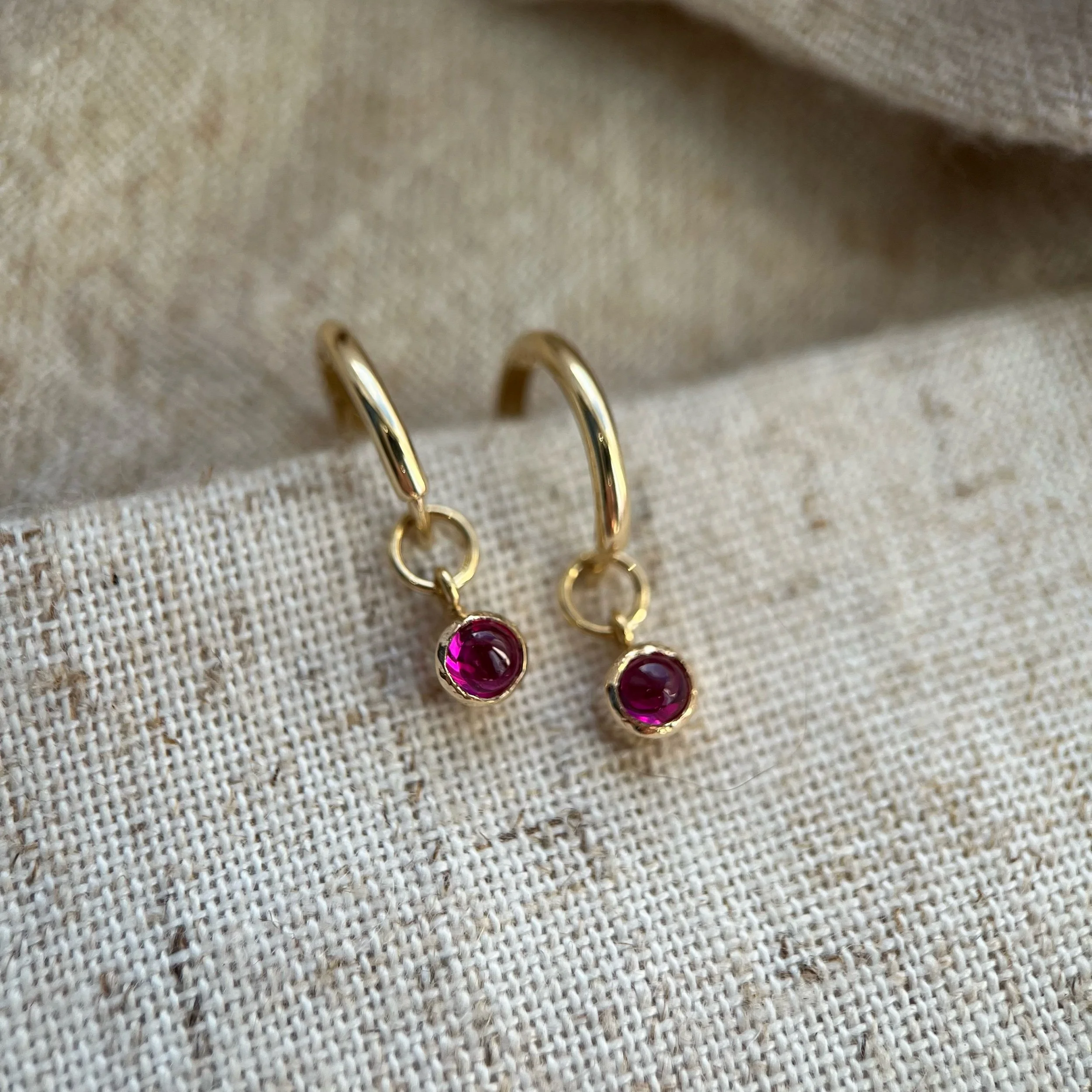 Genuine ruby cabochon hoop earring charms set in solid 9ct gold. Sold as a single or pair.