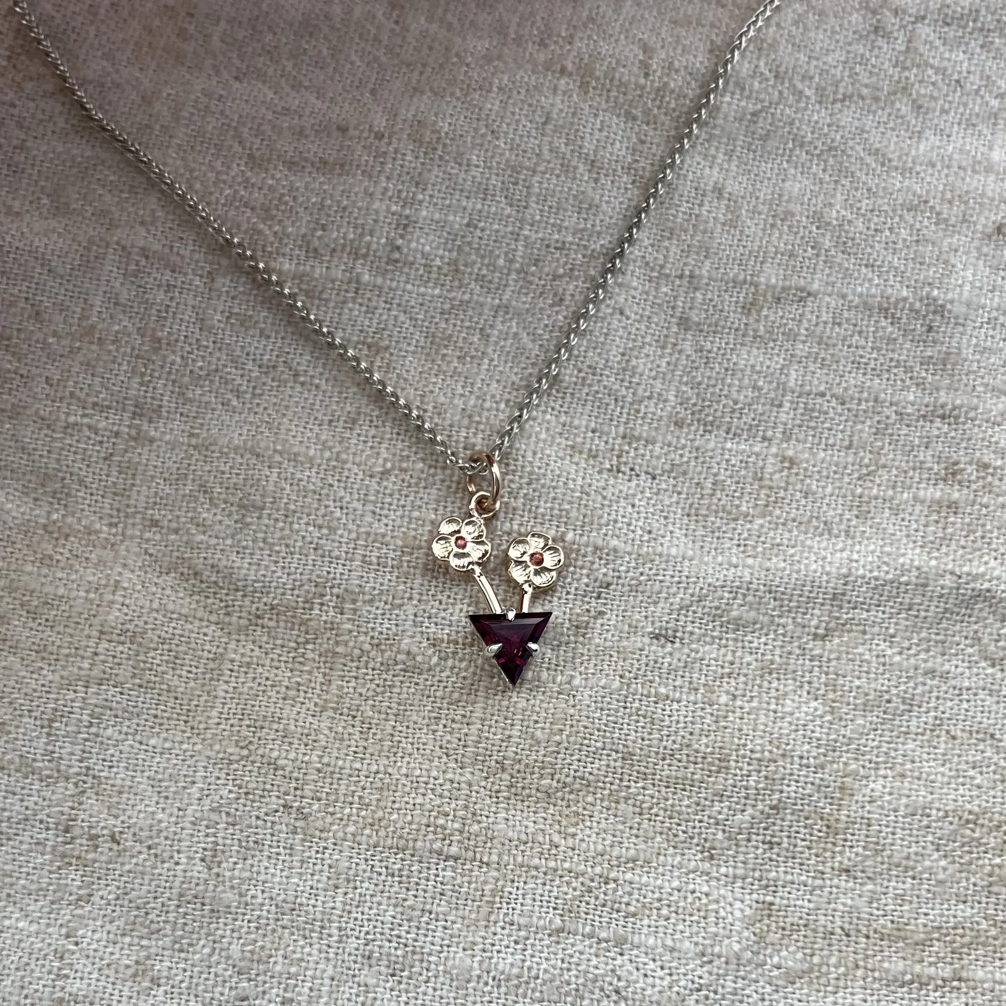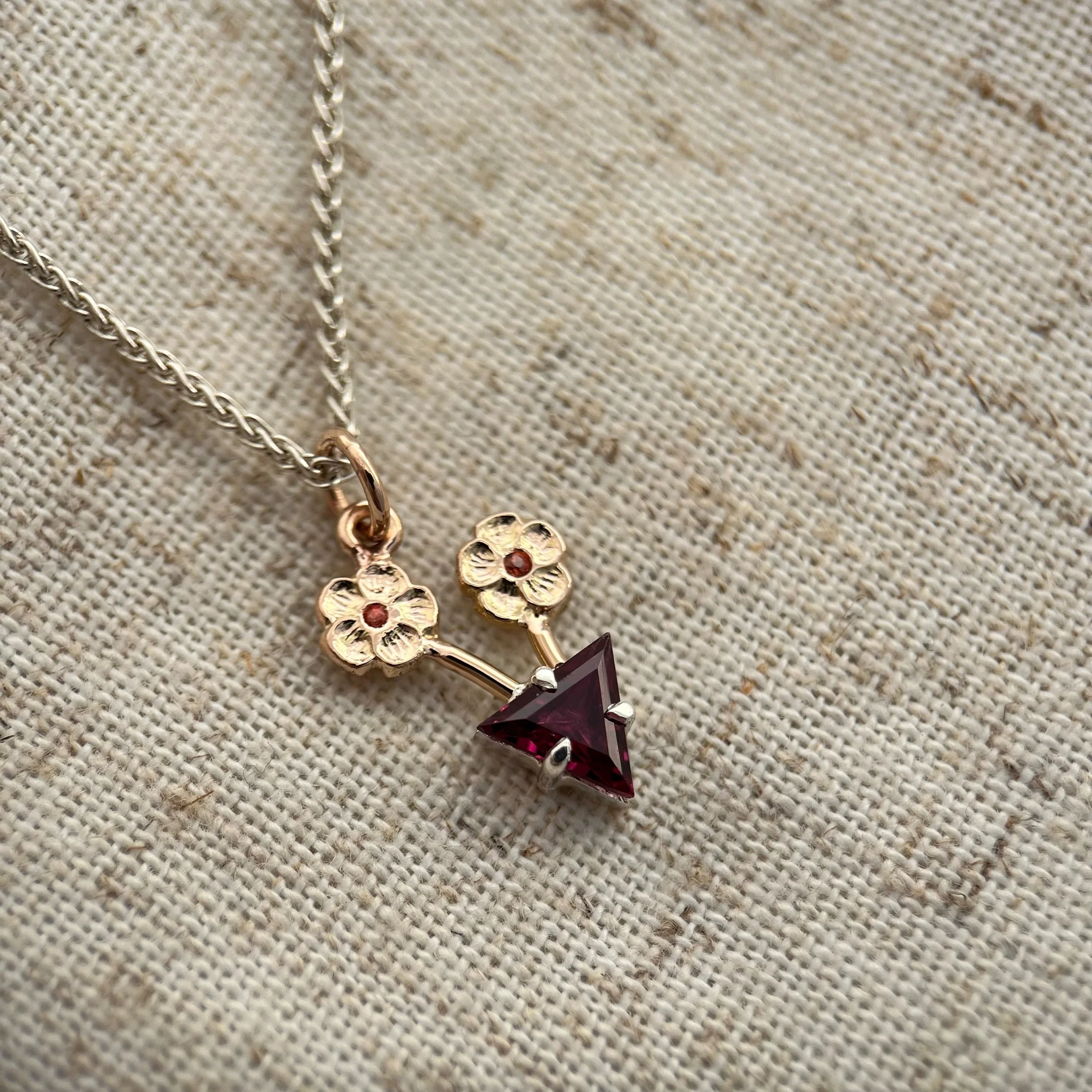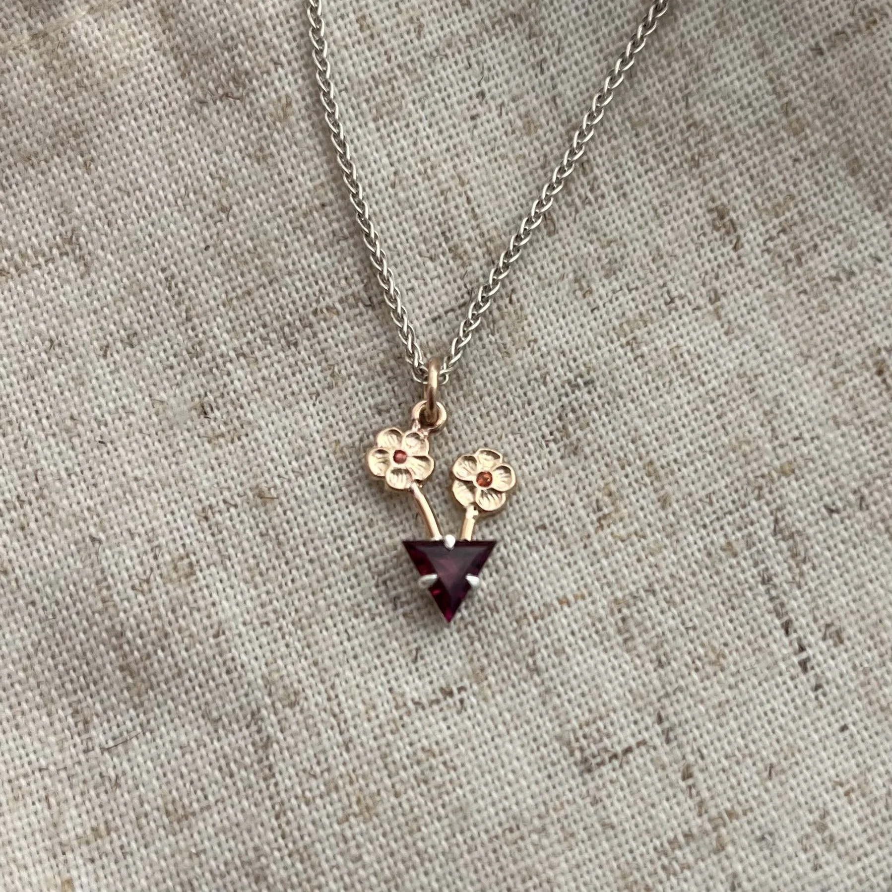 This genuine natural garnet flower pot pendant is made in sterling silver with solid 9ct rose gold flowers.