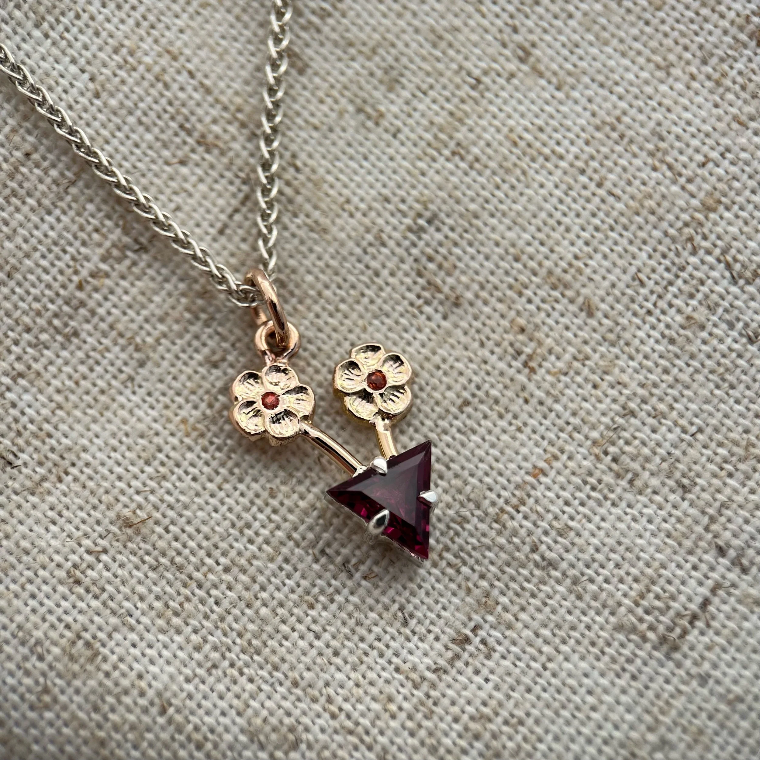 The triangular flower pot garnet is a beautiful deep pink and the centre of each flower is set with a tiny sparkling orange garnet.