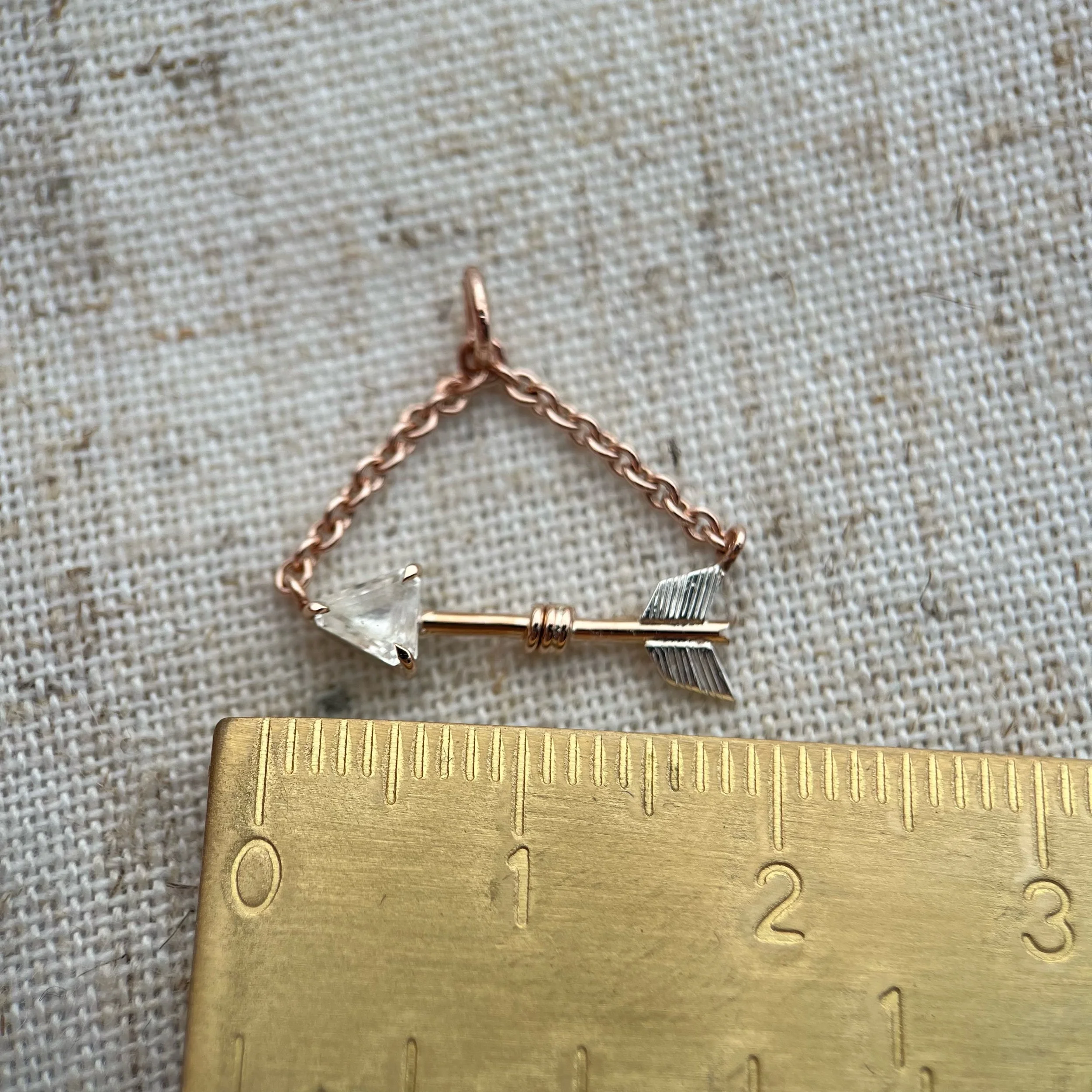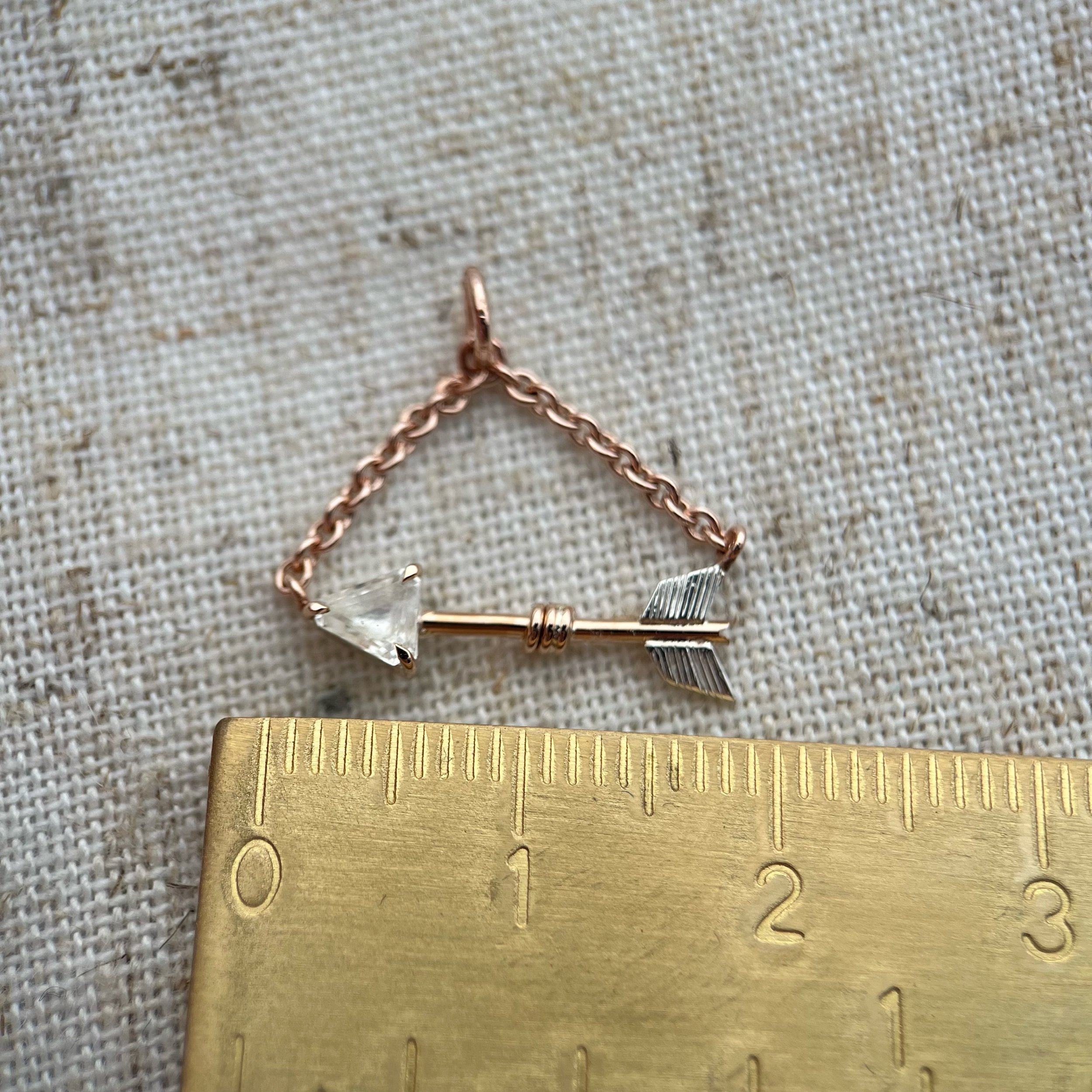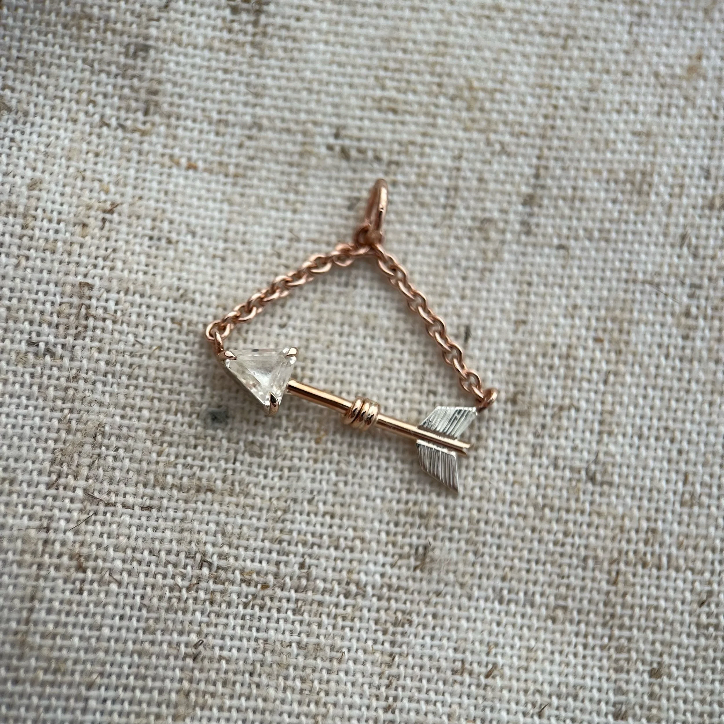 Genuine natural white sapphire arrow pendant. The main shaft of the arrow is solid 9ct rose gold while the details are made in sterling silver.