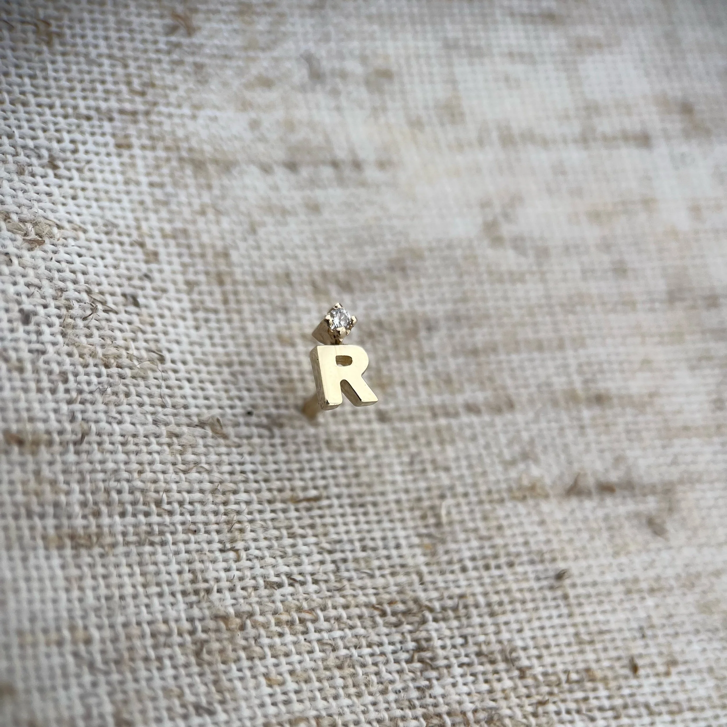 A 9ct yellow gold R letter single ear stud. Above the gold initial is a tiny 1.3mm natural genuine diamond.