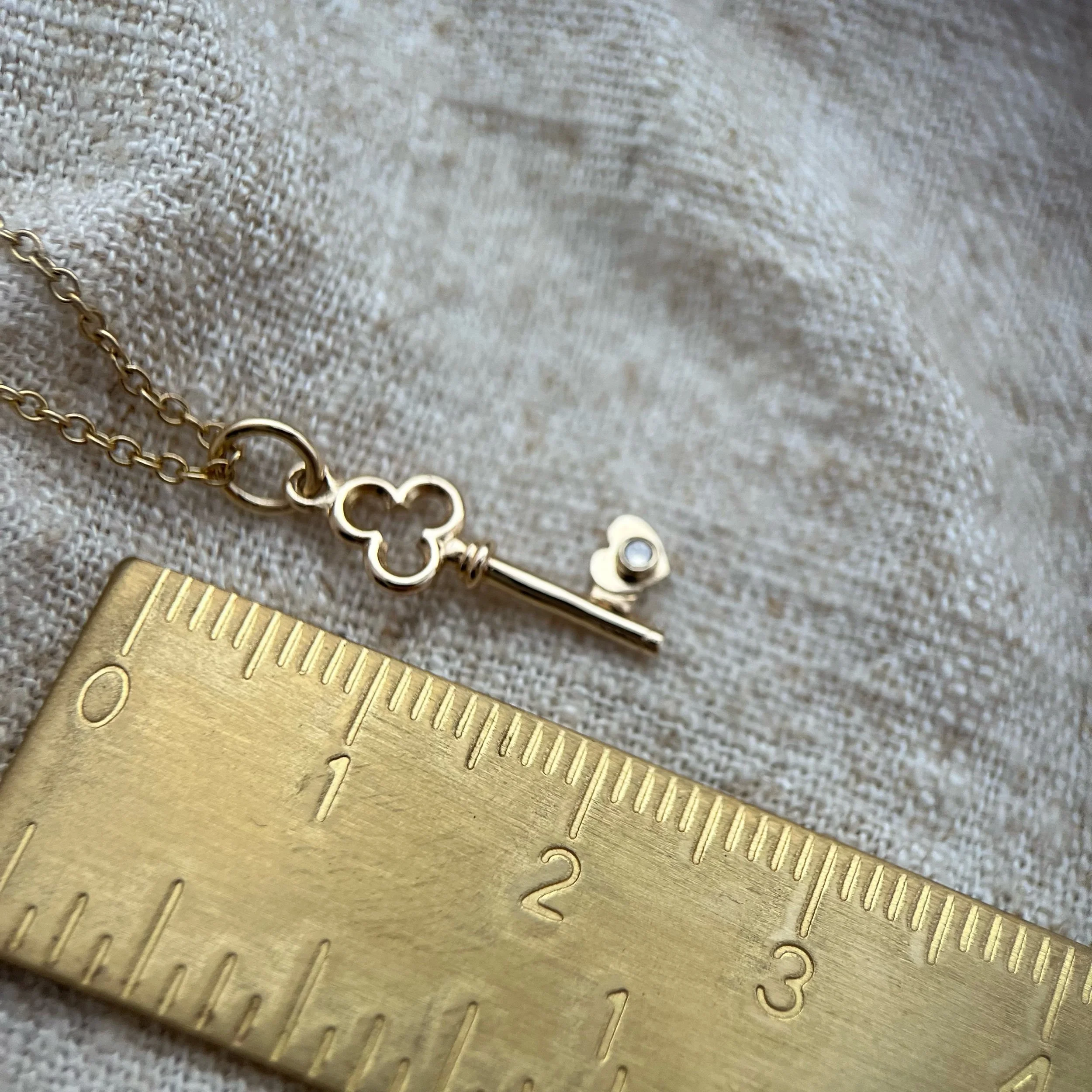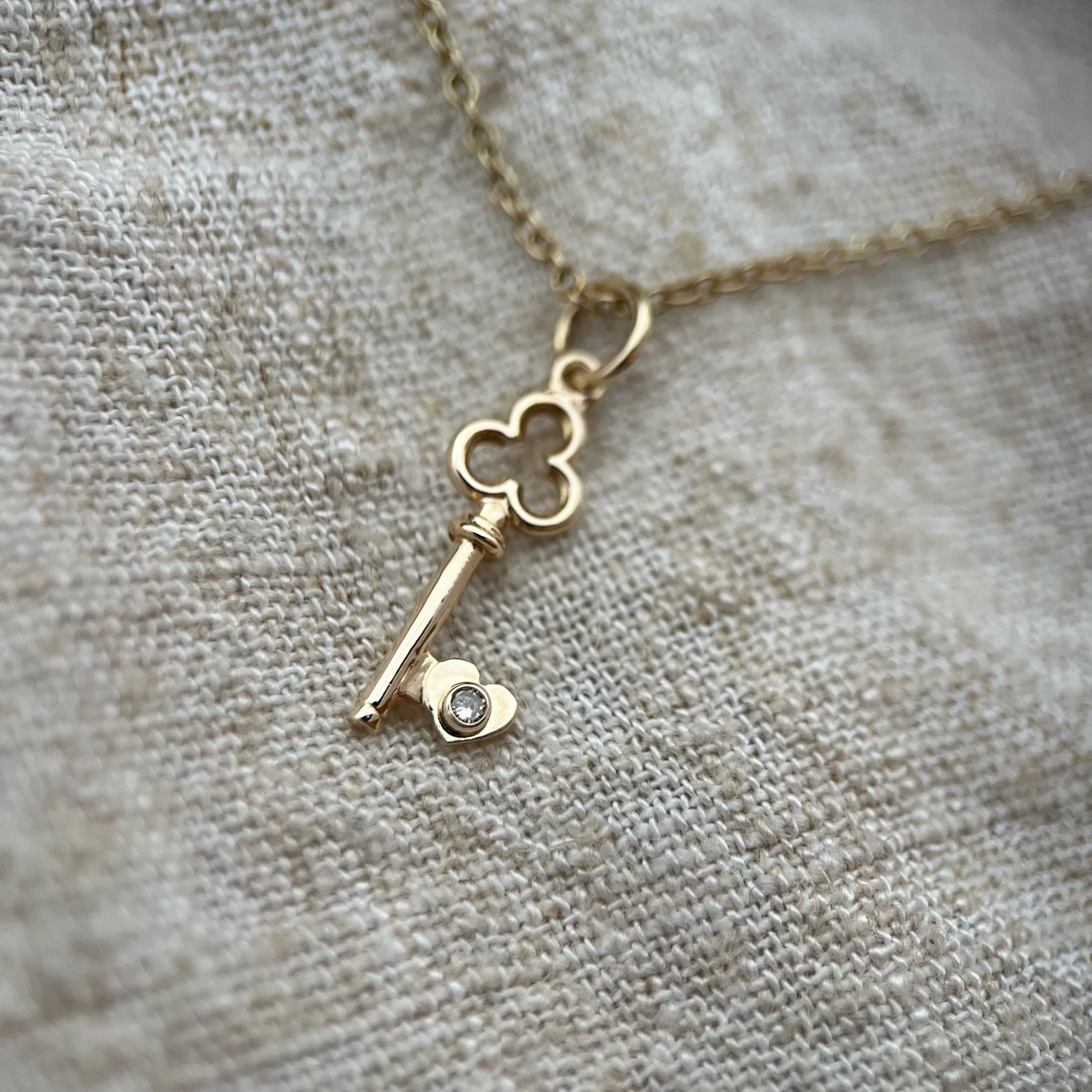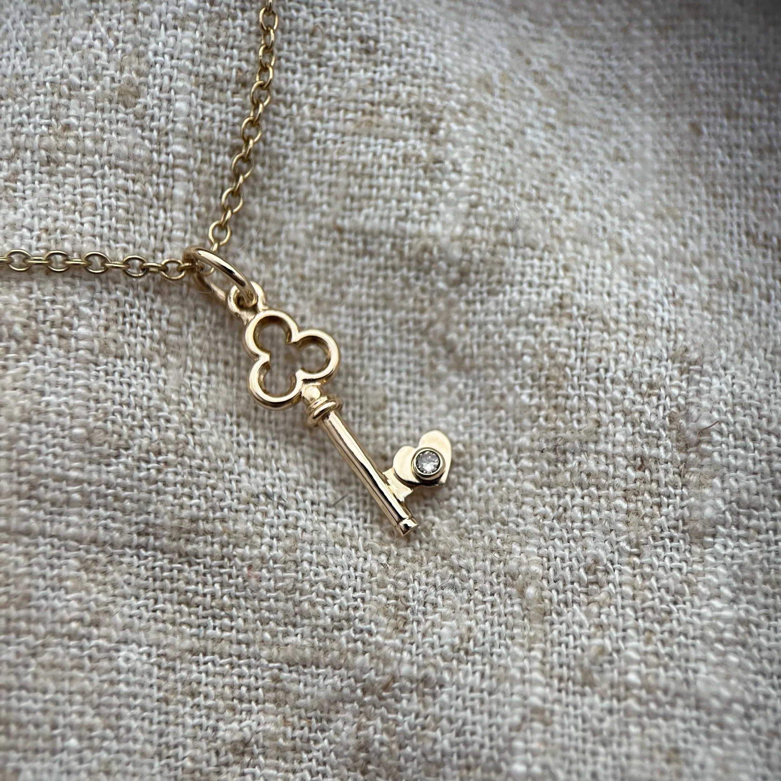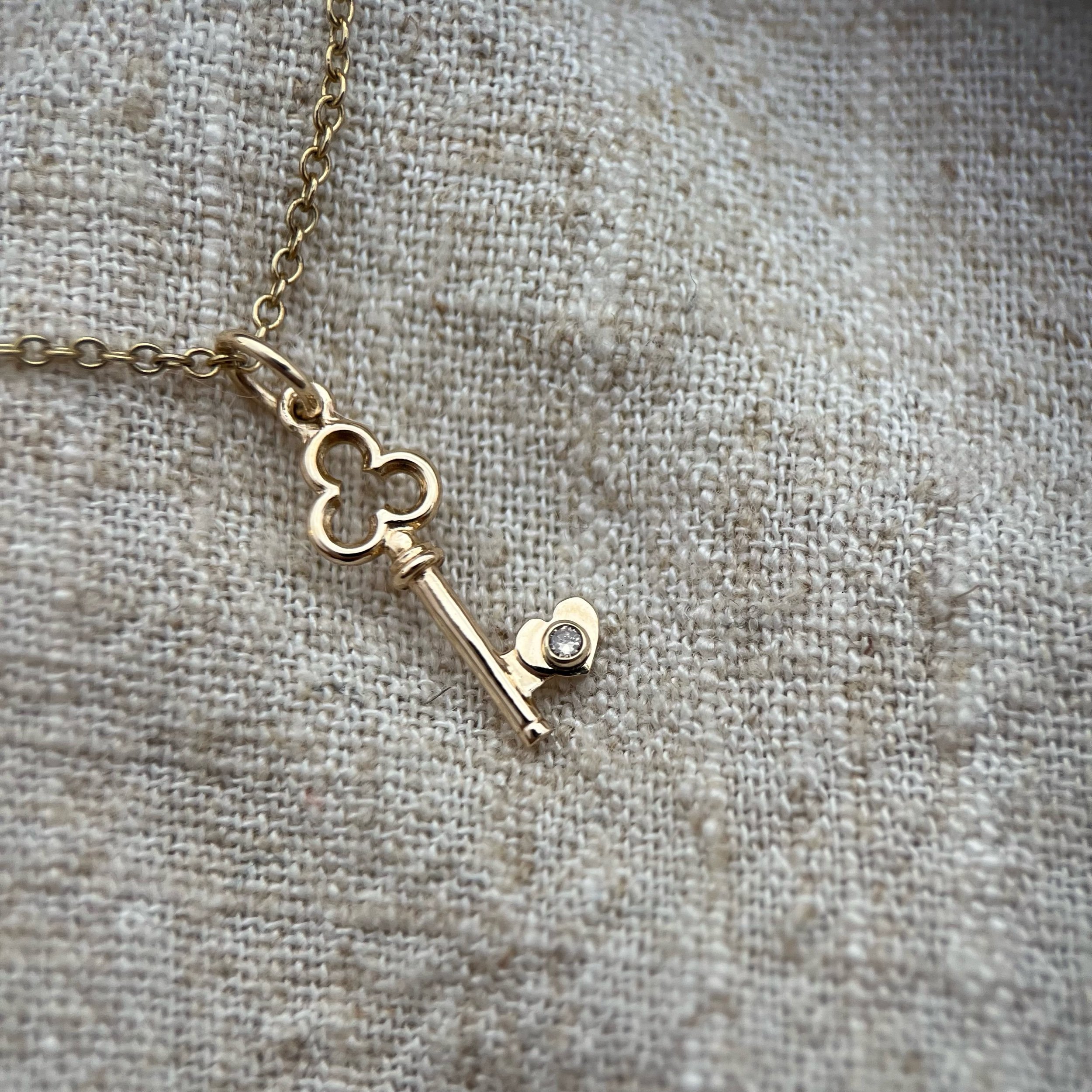 This is such a sweet little refurbished vintage 9ct gold key pendant with a heart. I have also added a little genuine natural champagne diamond.