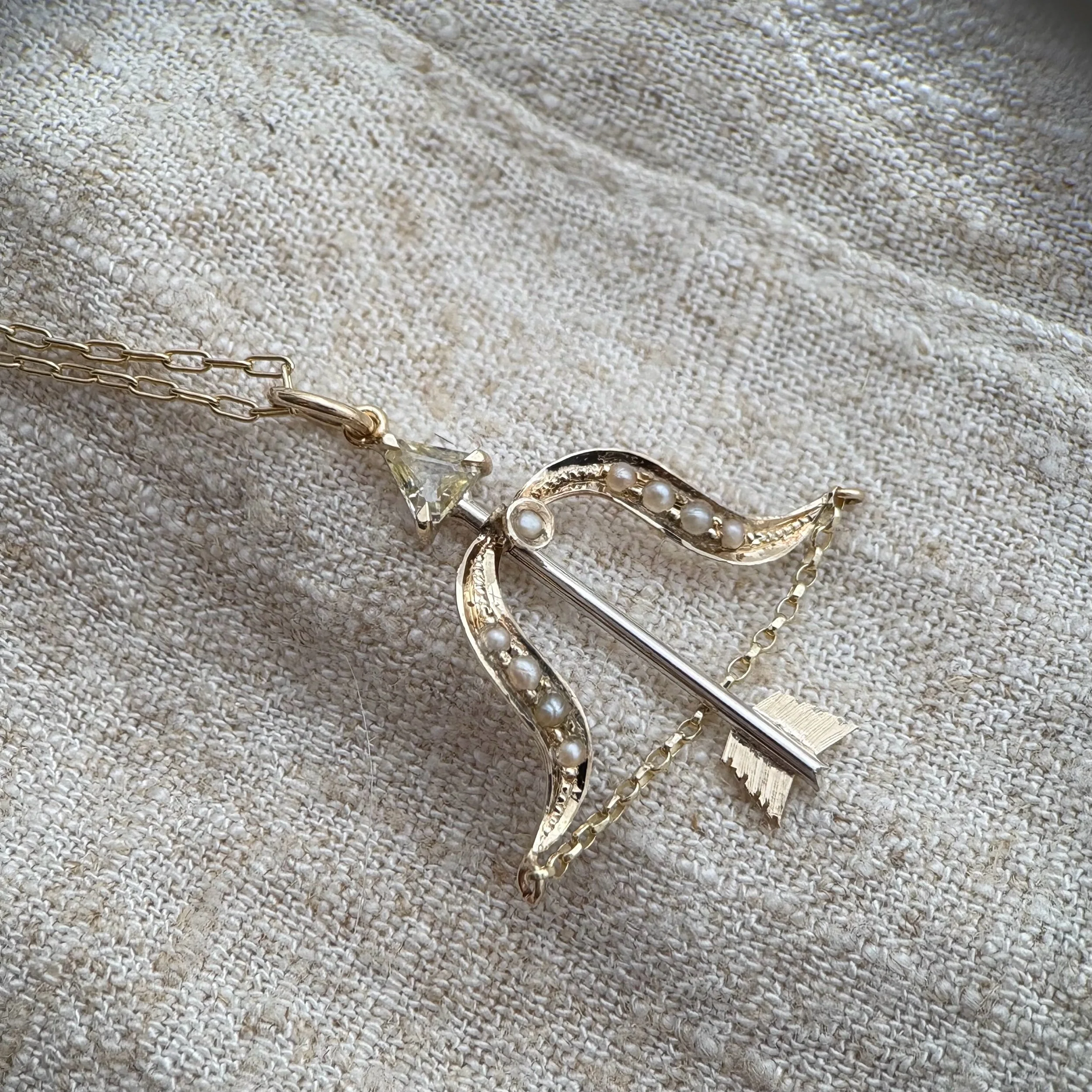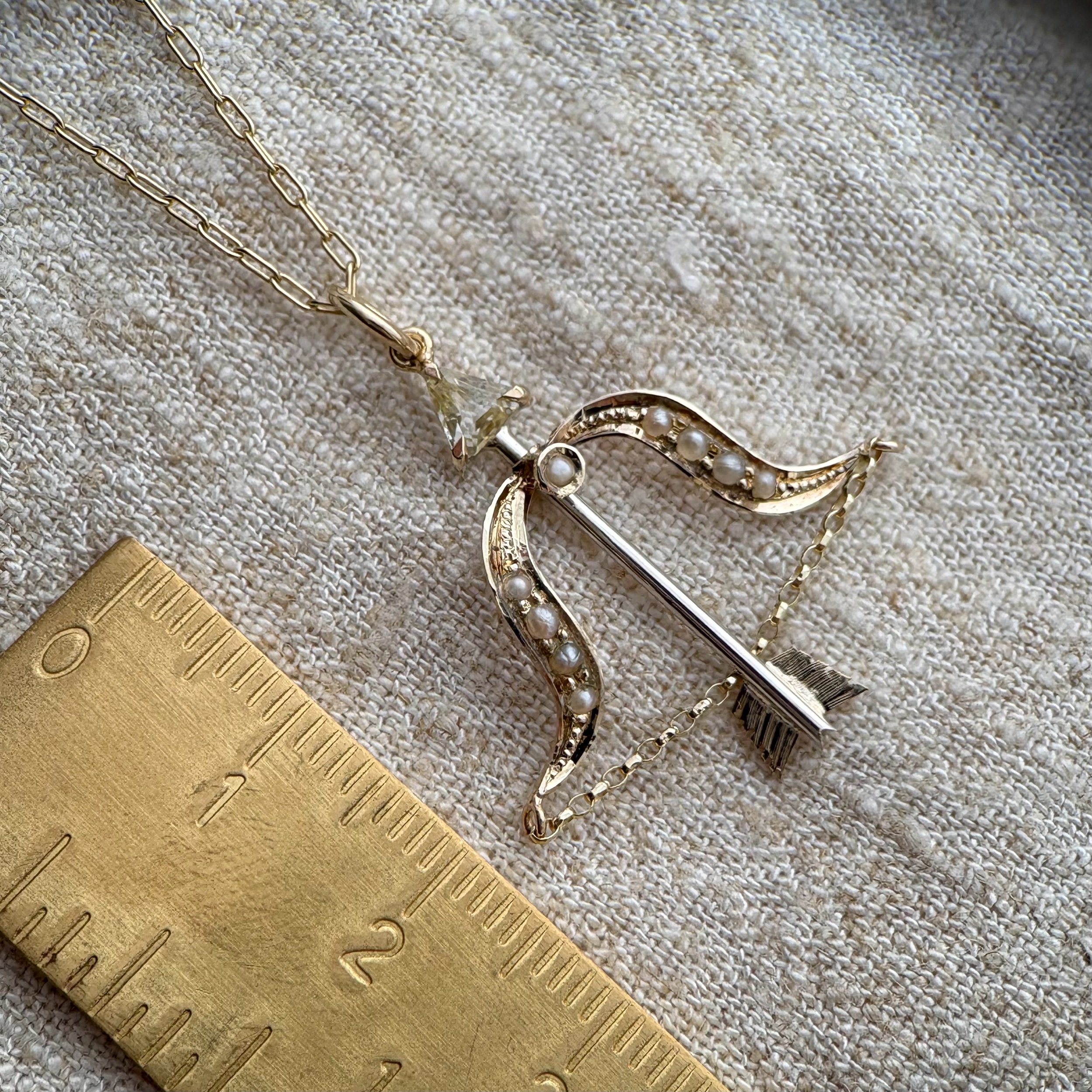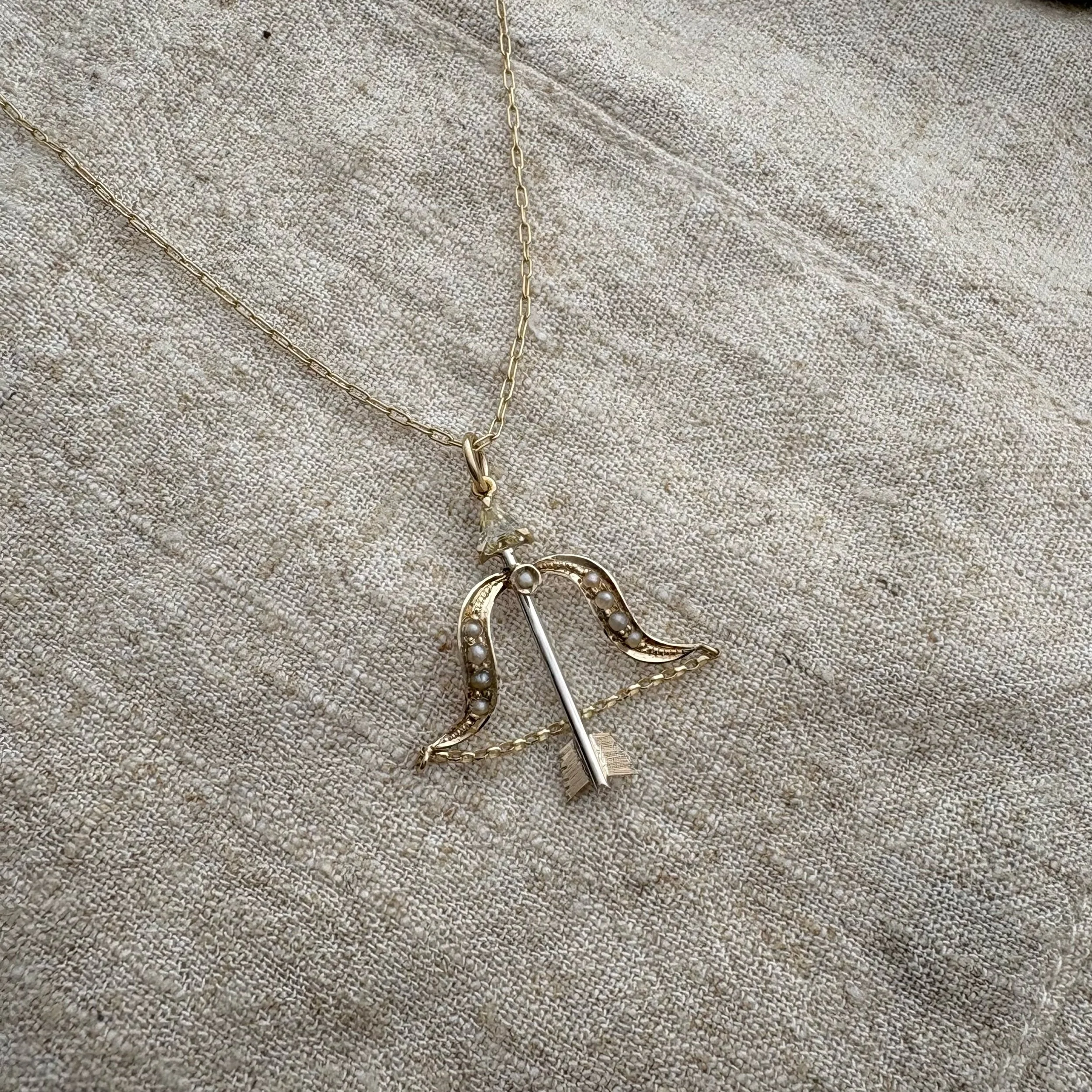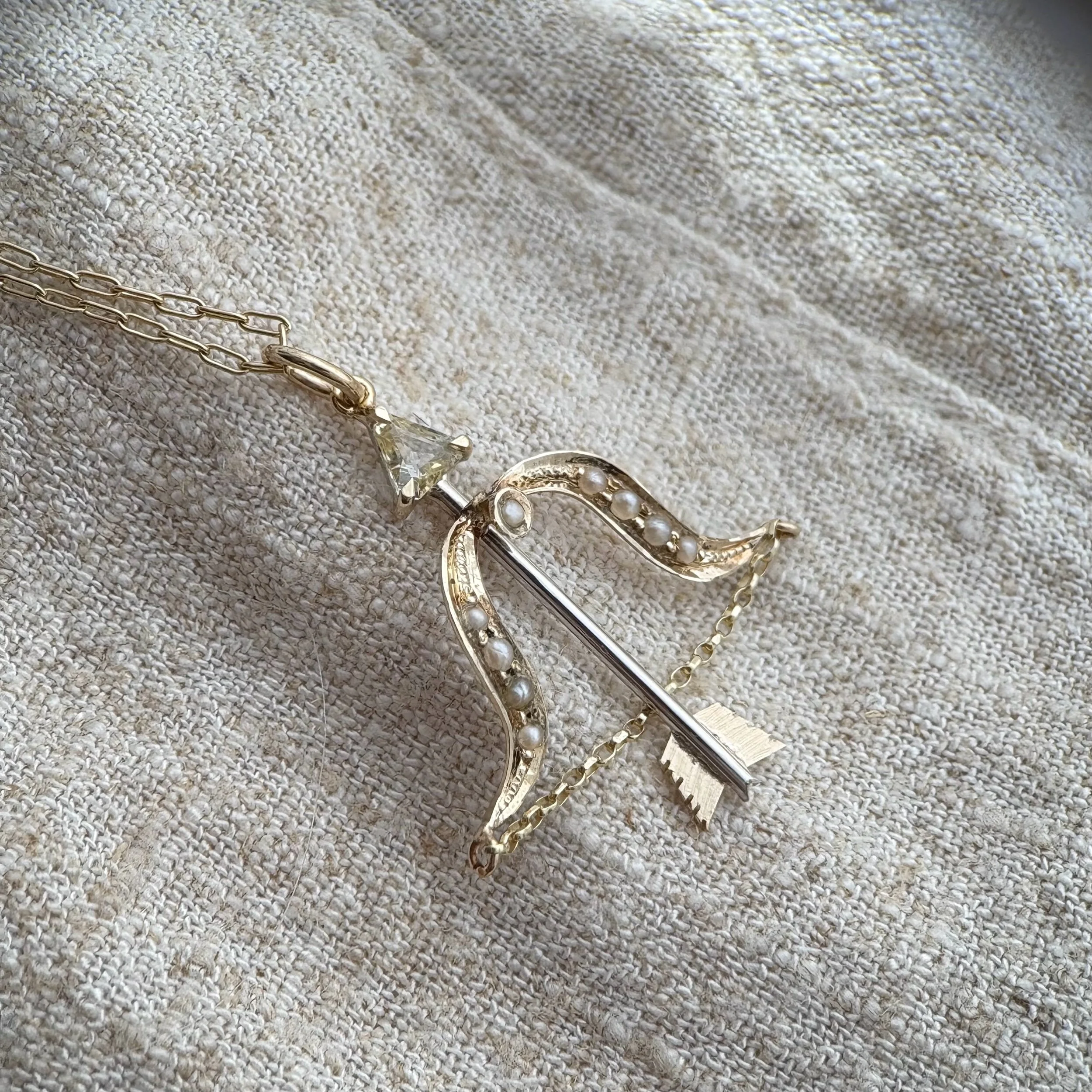 A genuine natural yellow sapphire arrow pendant. The main shaft of the arrow is sterling silver while all the details are made in solid 9ct yellow gold. The bow of the arrow is made from original Victorian 9ct gold and seed pearl elements.